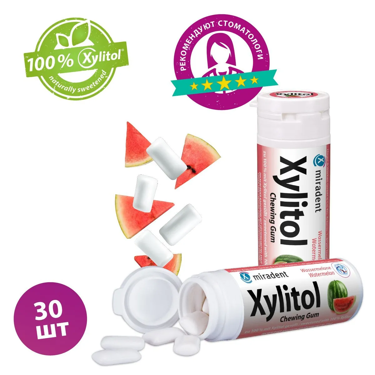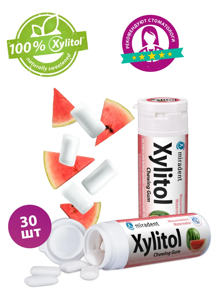 Жевательная резинка без сахара Miradent Арбуз!Жевательная резинка без сахара, с ксилитом Miradent Xylitol со вкусом арбуза. Жевательная резинка на 100% подслащена ксилитом, который подавляет вредоносные бактерии в полости рта и известен своим позитивным воздействием препятствия образования зубного налёта.