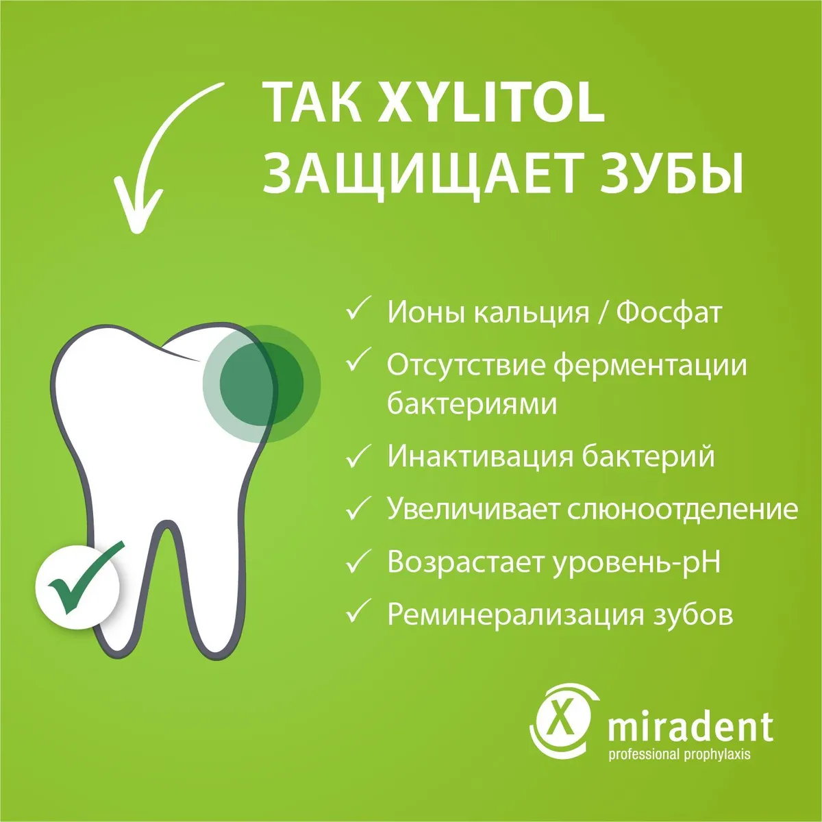 Ксилит 100%Так же ксилит формирует соединения кальция с протеинами в полости рта, что усиливает реминерализацию зубной эмали. Ксилитол создает во рту прохладное ощущение, похожее на освежающий вкус ментола. А так как жевательная резинка не содержит сахар и искусственные ингредиенты, то она подходит как диабетикам, веганам, так и просто людям, соблюдающим диету. miradent XYLITOL не содержит искусственные добавки для устойчивости вкуса, тем самым предотвращает не рекомендованное специалистами длительное жевание.