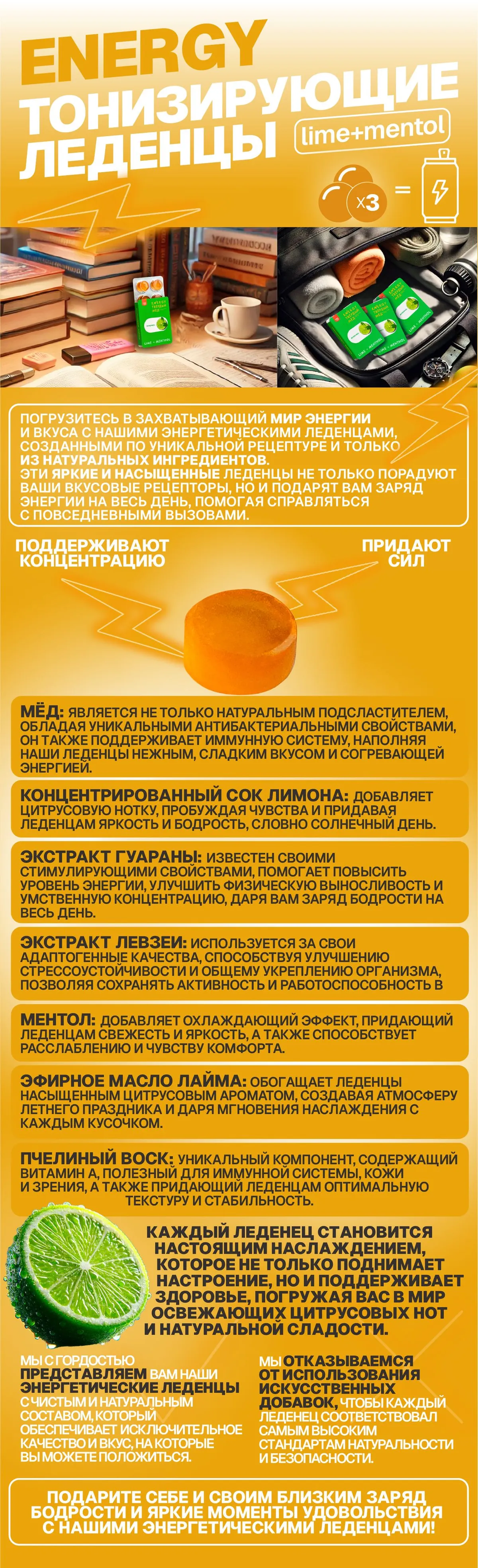 Мед, концентрированный сок лимона, экстракт гуараны, экстракт левзеи, ментол, эфирное масло лайма, воск пчелиный.