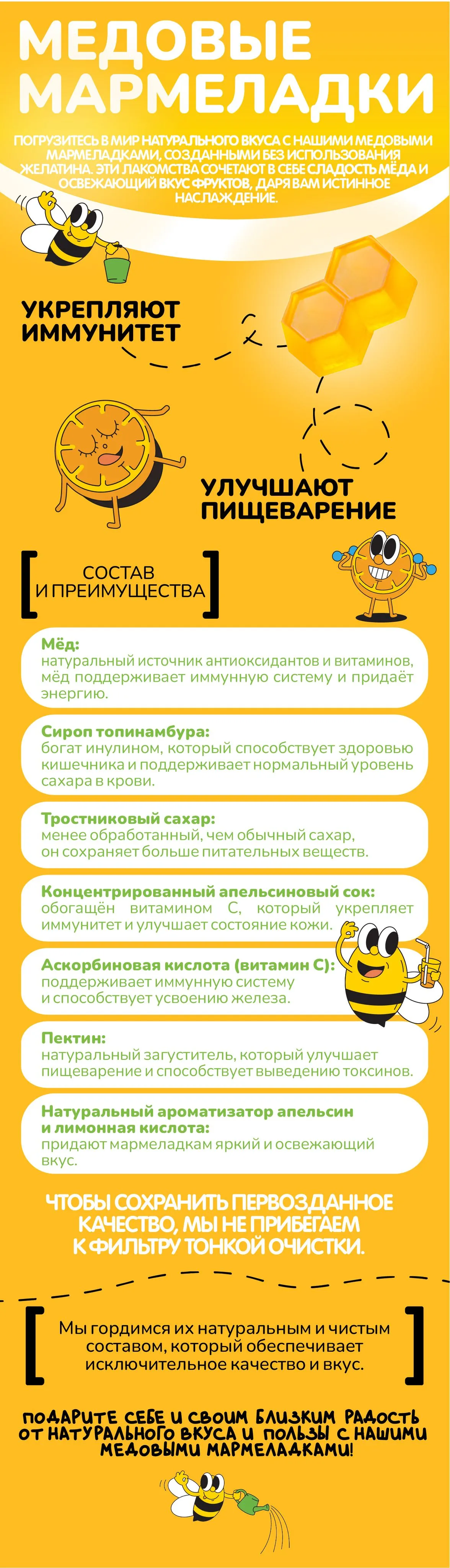 Мёд, сироп топинамбура, тростниковый сахар, концентрированный яблочный сок, экстракт облепихи, пектин, лимонная кислота, аскорбиновая кислота (витамин С). натуральный ароматизатор (облепиха), кокосовое масло, воск пчелиный