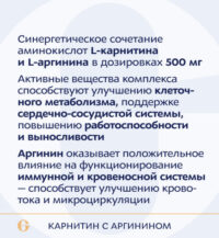 Аминокислота, природное витаминоподобное вещество. Играет важную роль в энергетическом обмене: способствует транспортировке длинноцепочечных жирных кислот в митохондрии, где они используются как источник энергии; способствует повышению активности и выносливости во время высоких физических нагрузок; оказывает положительное влияние на здоровье сердца, улучшая функции сердечной мышцы, способствует ускорению восстановления после интенсивных физических нагрузок, поддерживает когнитивные функции, проявляет антиоксидантные свойства.