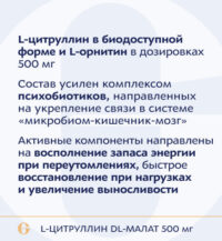 Представляет собой сочетание аминокислоты (цитруллина) и органической соли (малата). Такая форма аминокислоты усваивается лучше и быстрее начинает действовать. Основным механизмом антиастенического действия цитруллина является активное участие молекулы в цикле мочевины, что способствует более интенсивной переработке и элиминации продуктов обезвреживания мочевины.