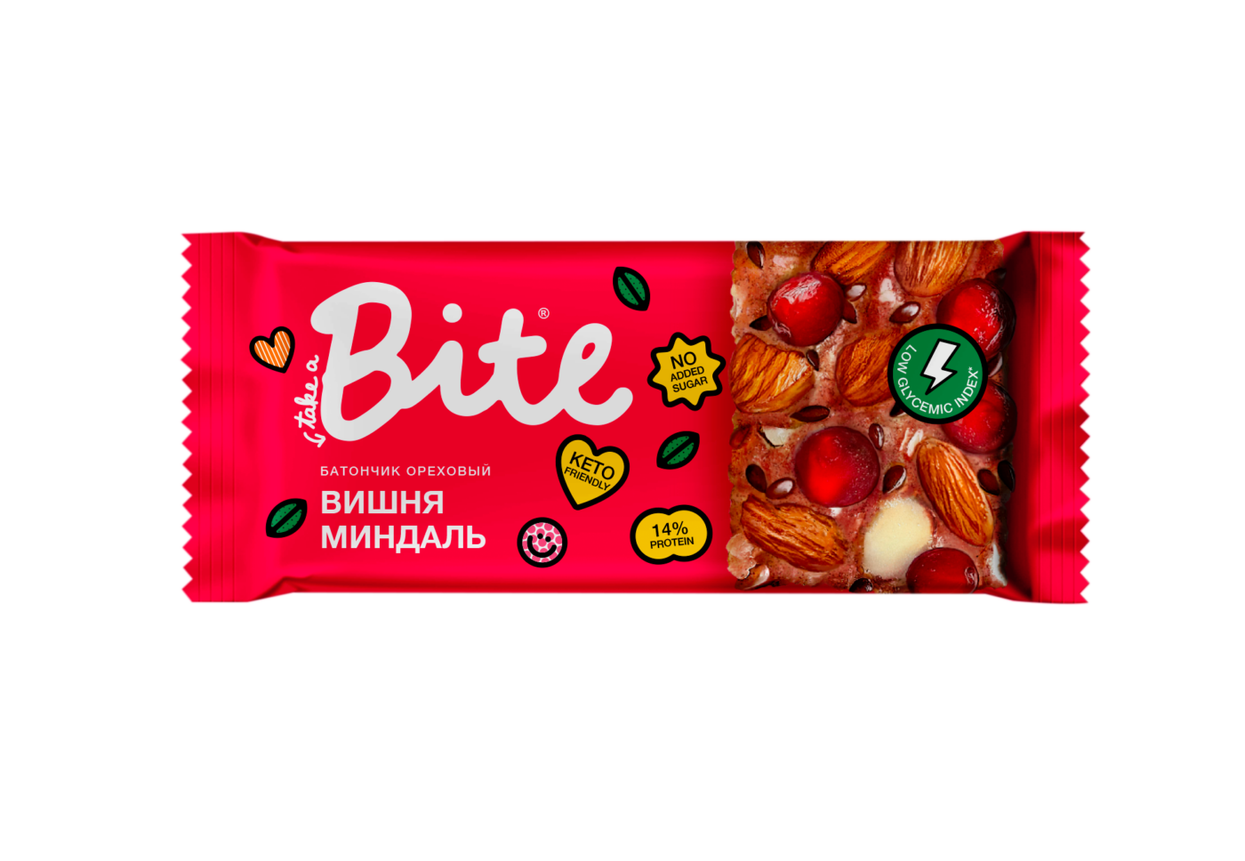 Батончик ореховый Bite Low GI с вишней и миндалем — инновационный и полезный перекус на основе ингредиентов с низким гликемическим индексом.