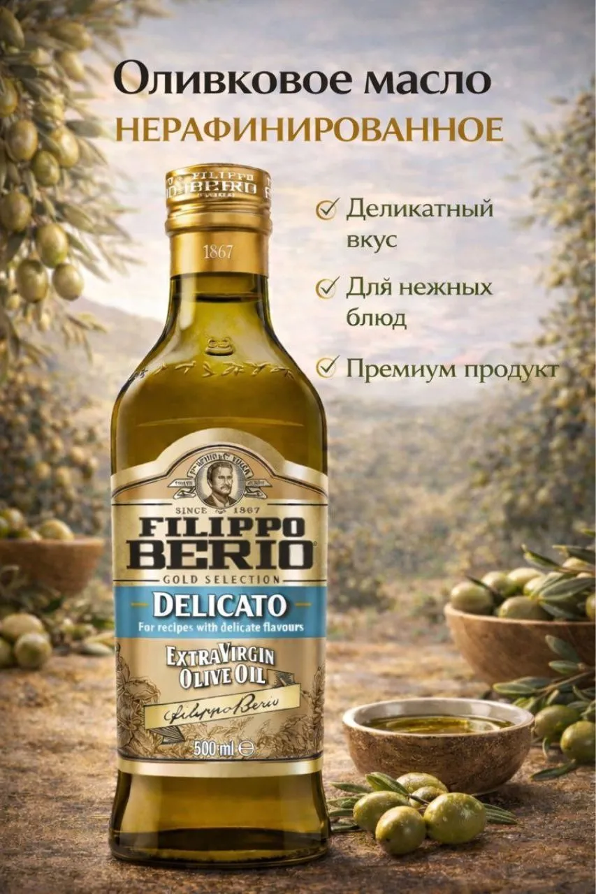 Оливковое масло extra virgin нерафинированное для салатов холодного отжима Delicato от бренда Filippo Berio — это настоящее гастрономическое сокровище, которое идеально дополнит ваше меню и подчеркнет вкус каждого блюда.