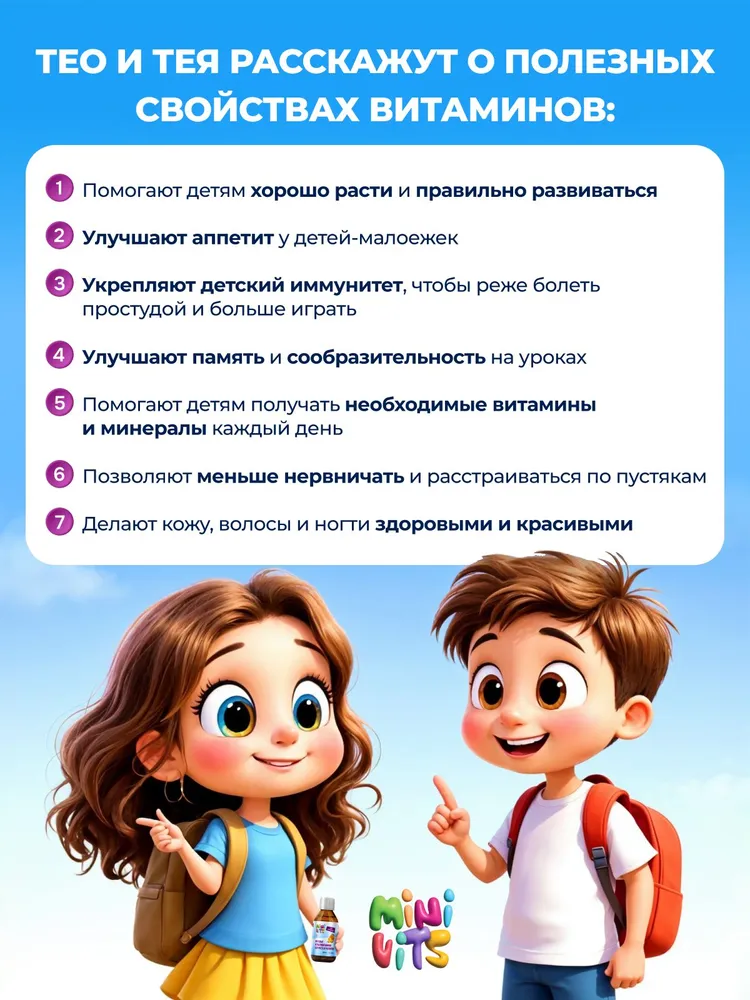 Minivits — это бренд качественных, вкусных и биодоступных витаминов, разработанный совместно с врачами, чтобы дети были здоровы, а родители за них спокойны.