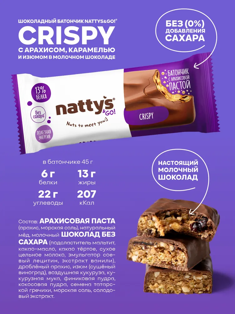 Шоколадные батончики Nattys &Go® — это батончики покрытые настоящим молочным шоколадом, без добавления сахара, очень вкусный, полезный и абсолютно натуральный перекус, который доставит много удовольствия и зарядит энергией!
