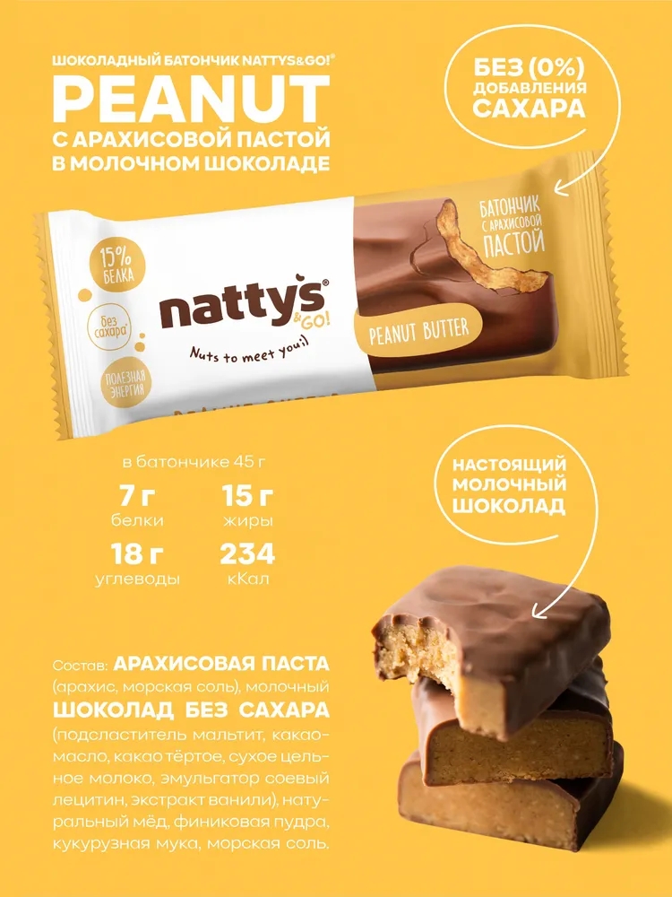 Шоколадные батончики Nattys &Go® Peanut — это батончики с арахисовой пастой внутри, покрытые настоящим молочным шоколадом, без добавления сахара, очень вкусный, полезный и абсолютно натуральный перекус, который доставит много удовольствия и зарядит энергией!