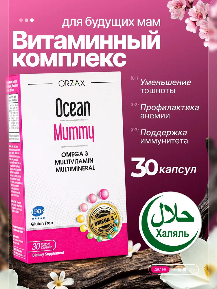 Главной особенностью БАД является высокое содержание ДГК — 200 мг в каждой капсуле. Предназначен специально для беременных и кормящих женщин, обеспечивая им и их детям нужные питательные вещества. Ocean Mummy поддерживает общее состояние здоровья матери во время беременности, помогает уменьшить послеродовое беспокойство. Также этот комплекс помогает снизить риск пищевой аллергии у ребенка.