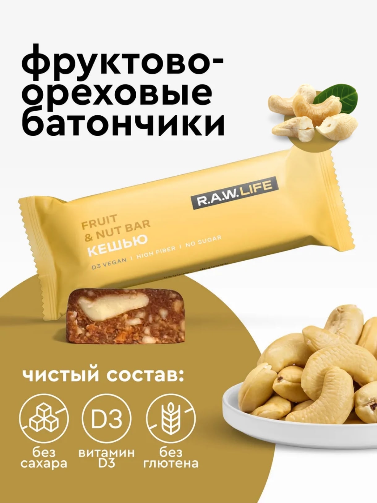 В ингредиентах наших фруктово-ореховых батончиков нет консервантов, красителей и тепловой обработки. Все ингредиенты на 100% натуральны и легко усваиваются. Эти принципы позволяют получить максимум пользы, вкуса и энергии. На завтрак или ужин, до и после тренировки, в разгаре рабочего дня и во время путешествия — батончики R.A.W. LIFE утолят голод, зарядят энергией и поднимут настроение для новых впечатлений.