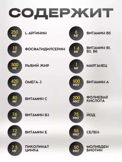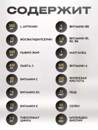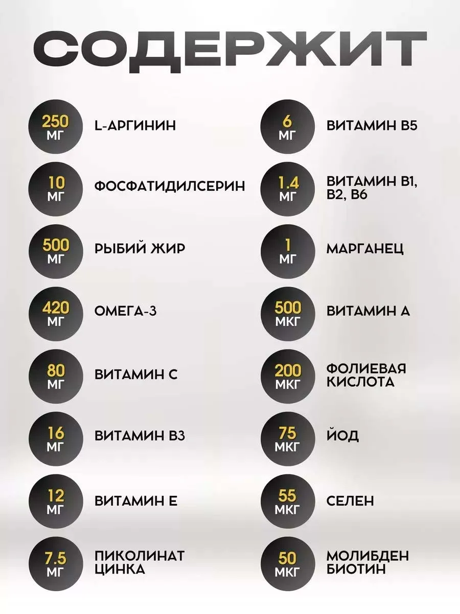 Состав | омега 3; Л-аргинин; витаминыАВСЕ; цинк; селен; Йод; витамин д3 |