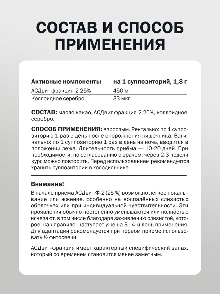 АКТИВНЫЕ КОМПОНЕНТЫ АСДвит 2-Ф 25% – 450 мг Коллоидное серебро – 33 мкг Состав: масло какао, АСДвит Ф-2 25%, коллоидное серебро.