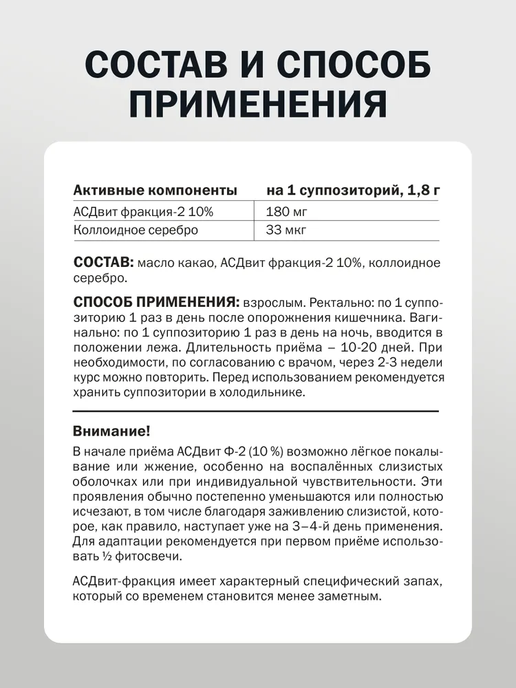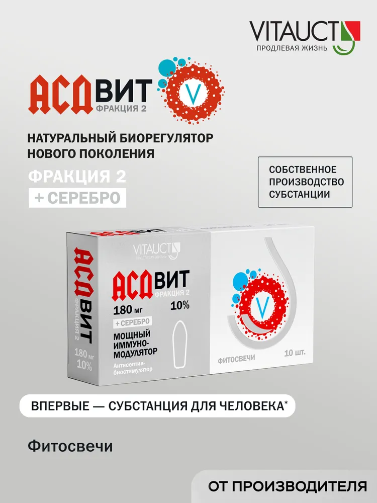 Фитосвечи АСДвит-2Ф 10% от Компании Витаукт — чистая субстанция для вагинального и/или ректального применения. АСДвит от VITAUCT — первая субстанция, созданная специально для человека. Содержит в 1,5–2,5 раза больше активных компонентов, чем классическая Ф-2, благодаря чему обладает расширенным спектром действия. АСДвит стимулирует жизненные функции организма. Широкий спектр действия объясняется содержанием веществ, схожих с биогенными стимуляторами, которые запускают процессы восстановления и повышают устойчивость организма. •Поддерживают восстановление организма после заболеваний, интенсивных физических и эмоциональных нагрузок •Активизируют обменные процессы и регенерацию тканей •Усиливают иммунитет и повышают устойчивость к вирусным, бактериальным и грибковым инфекциям •Обладают антисептическим противовоспалительным и детоксикационным действием •Поддерживают нормализацию обмена веществ и пищеварения, улучшает усвоение питательных веществ •Стимулируют моторную активность желудочно-кишечного тракта, секрецию пищевых желез и активность пищеварительных ферментов •Поддерживают работу нервной и эндокринной систем •Способствуют поддержке организма после химио- и лучевой терапии •Обладают противоопухолевым эффектом, подавляя деление опухолевых клеток АСДвит — уникальная разработка VITAUCT! АСДвит от VITAUCT — первая субстанция антисептического стимулятора из свежего пищевого сырья для человека. АСДвит-2Ф превосходит ветеринарную 2-Ф благодаря содержанию уникальных активных компонентов, расширяющих фармакологическое действие. Он также отличается повышенной степенью очистки и полностью сохраняет все активные вещества ветеринарной 2-Ф, обеспечивающие её биологическую активность. АСДвит-2Ф — концентрат органических веществ, образующихся в процессе пиролиза белков и жиров животного происхождения. АСДвит-2Ф содержит низкомолекулярные органические кислоты, амины, пептиды, аминокислоты и минеральные компоненты. Именно их комбинация обеспечивает биостимулирующие свойства препарата. Это уникальный биокомплекс веществ, оказывающих комплексное воздействие практически на все системы организма. Фракция АСДвит не действует избирательно на какой-либо один орган или систему. Такая универсальность обусловлена особенностью его состава: при перегонке органические вещества распадаются на очень мелкие частицы — низкомолекулярные компоненты. По своей структуре они сходны с естественными продуктами обмена веществ клеток, поэтому фракция АСДвит воспринимается организмом как «своя» и может оказывать системное комплексное действие. Механизм действия Субстанция содержит органические компоненты, сходные с естественными продуктами обмена веществ. Благодаря этой биосовместимости они легко распознаются клетками и включаются в регуляторные процессы, что объясняет широкий спектр действия препарата: стимуляция обмена, укрепление защитных сил и восстановление тканей. Технология получения пищевой фракции АСДвит АСДвит проходит многоступенчатую очистку для получения максимально чистой и эффективной субстанции. После разделения фракций АСДвит-2 и АСДвит-3 лёгкая фракция АСДвит-2 содержит мелкие взвеси, придающие ей естественную мутность. Для их удаления применяется специальный метод, который одновременно ул