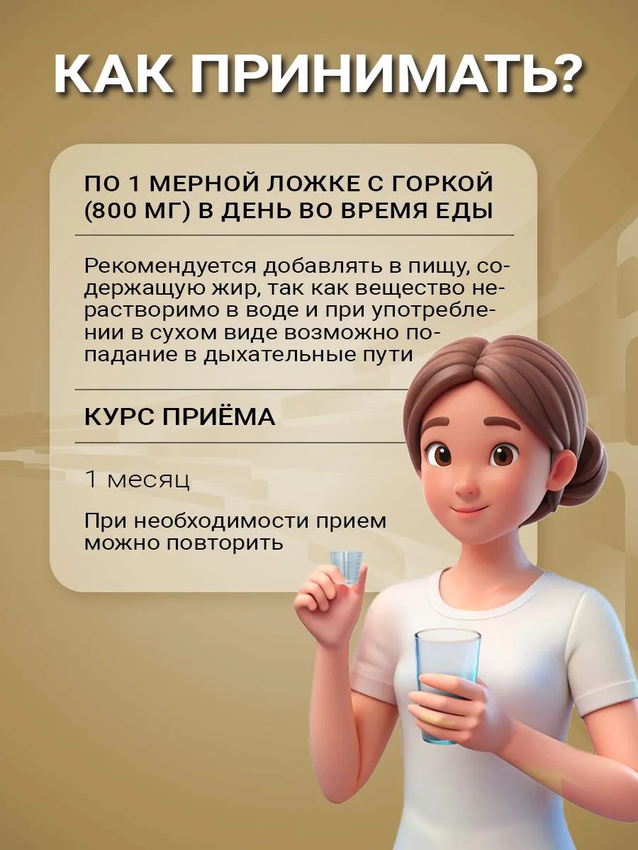 Взрослым по 1 мерной ложке с горкой (800 мг) в день во время еды. Продолжительность приема — 1 месяц. При необходимости прием можно повторить.