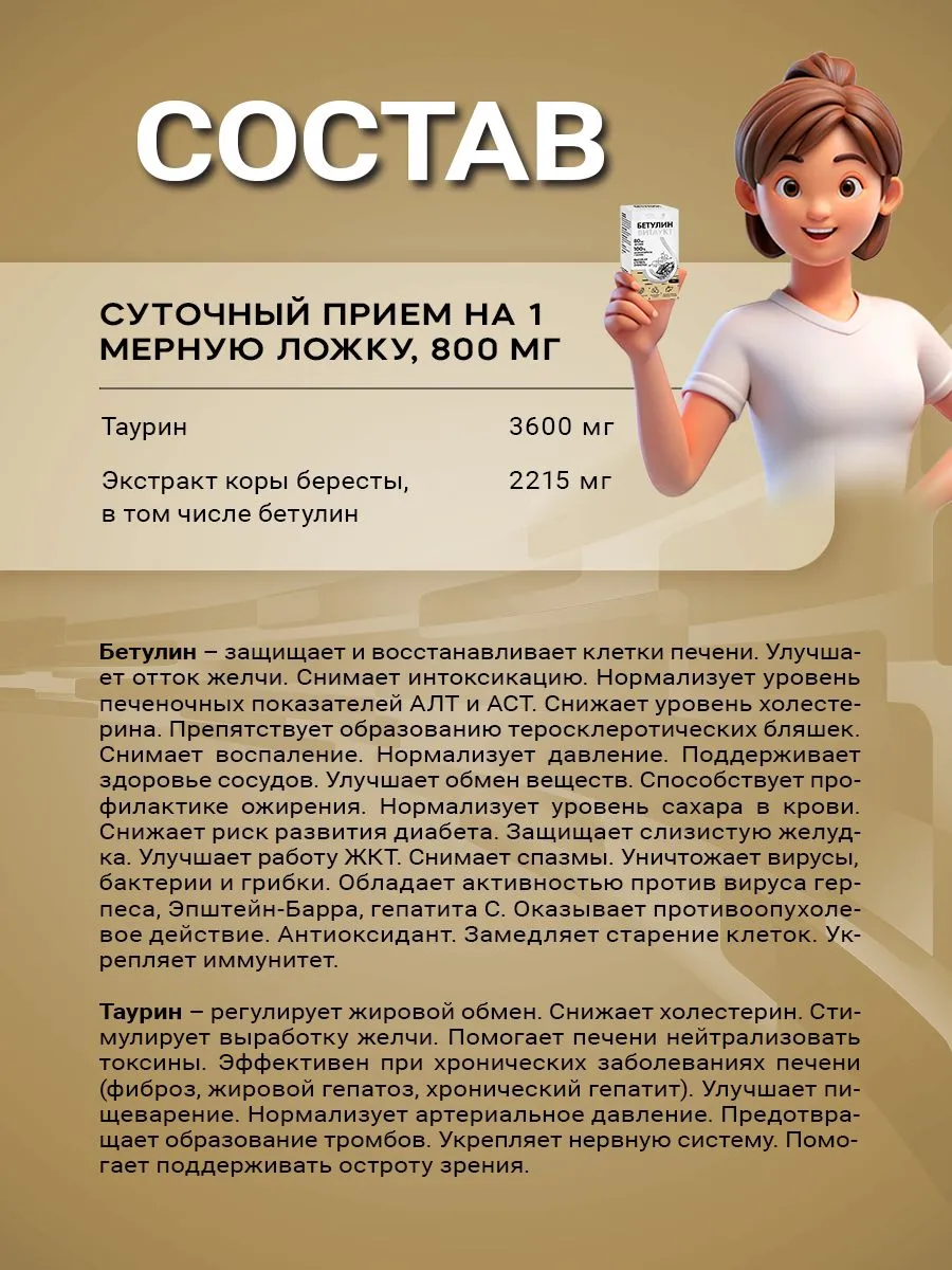 Суточный прием на 1 мерную ложку, 800 мг Таурин 720 мг Экстракт коры бересты, в том числе бетулин 80 мг