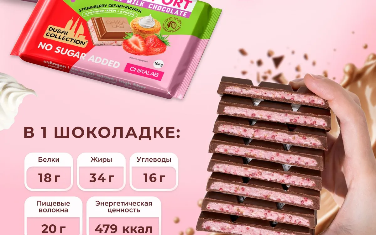 Chikasport ТМ «CHIKALAB» Молочный шоколад Dubai с клубникой и хрустящим тестом 100 гр.